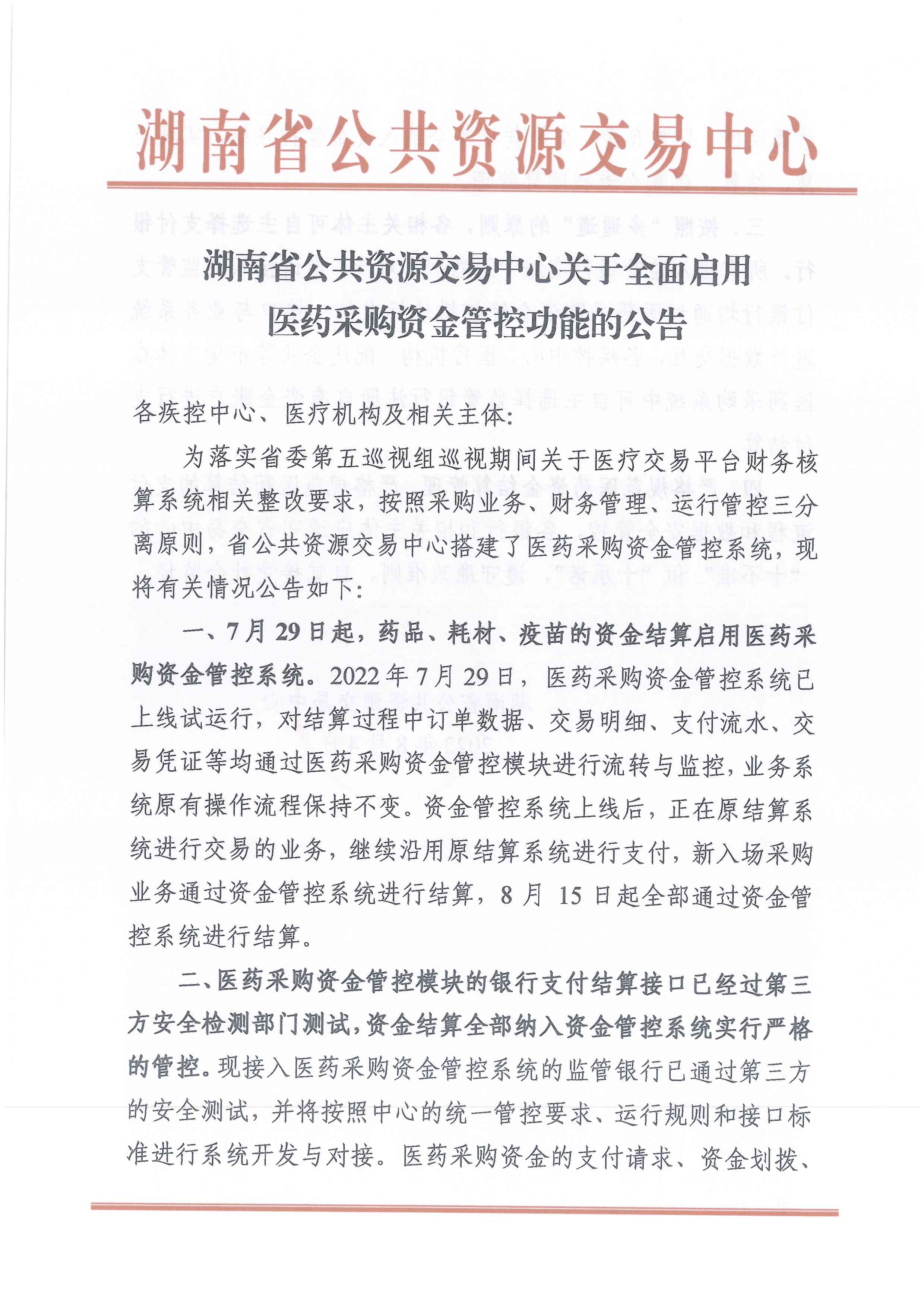 湖南省公共资源交易中心关于全面启用医药采购资金管控功能的公告