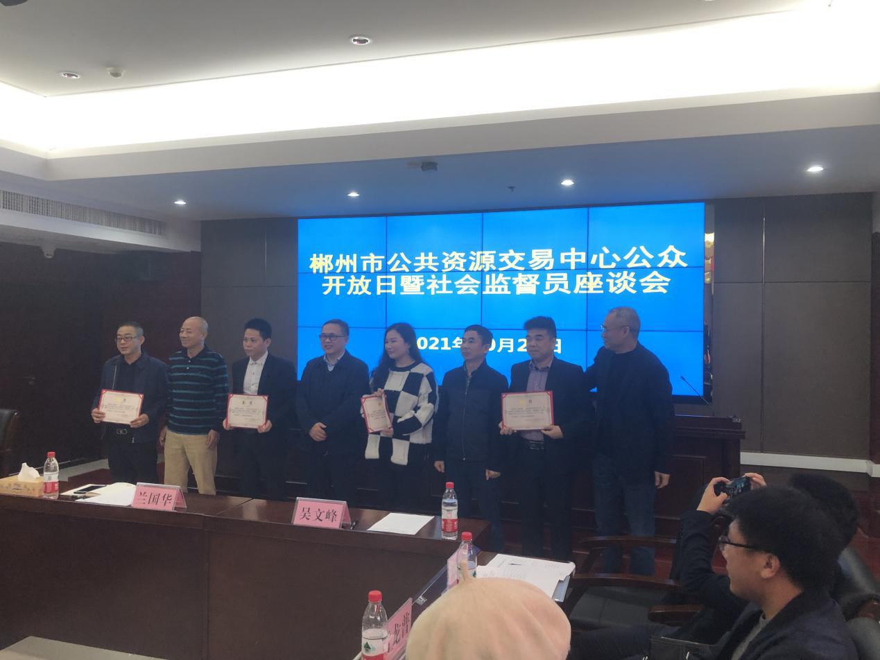 10月29日,郴州市公共资源交易中心举办“公众开放日”暨社会监督员座谈会,对新聘的20名社会监督员进行了业务培训,并颁发聘书。郴州市交易中心主任何超南出席会议并讲话。