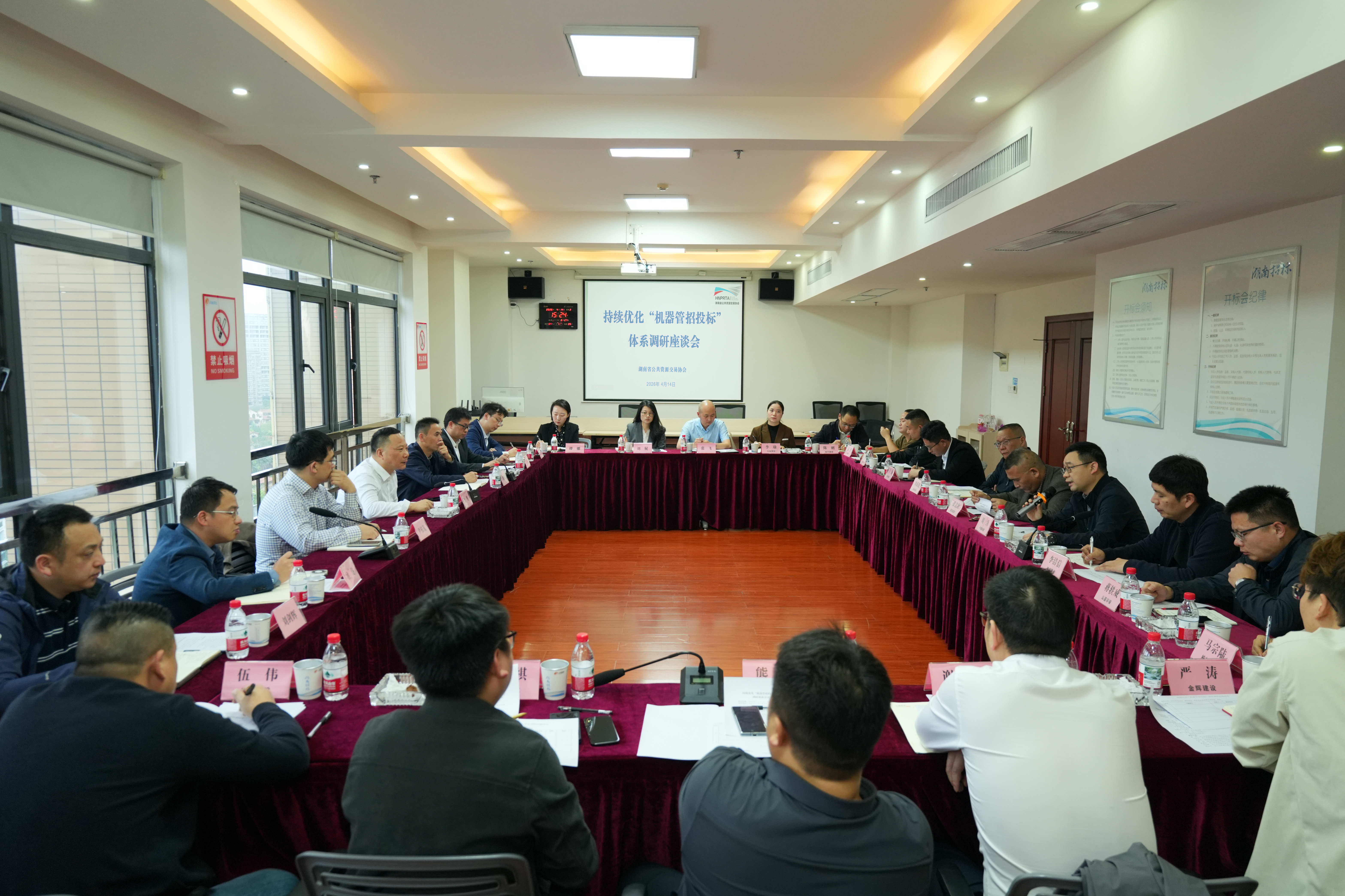 4月14日,省公共资源交易中心党组书记、主任曾胜到湖南省公共资源交易协会调研,并主持召开持续优化“机器管招投标”体系经营主体调研座谈会。省公共资源交易中心党组成员、副主任邓旺东参加。