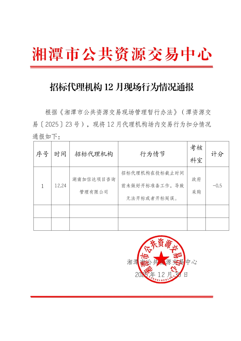 - 名称: 湘潭:招标代理机构12月现场行为情况通报