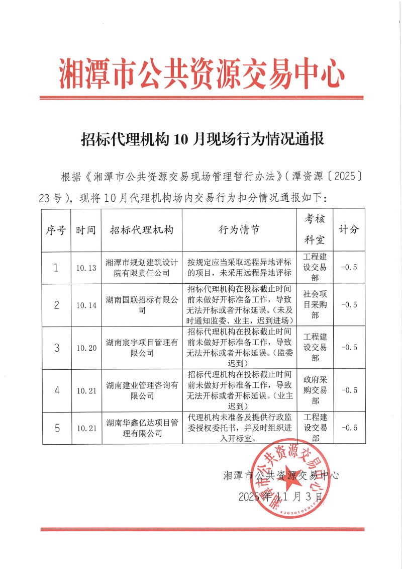 - 名称: 湘潭:招标代理机构10月现场行动情况通报